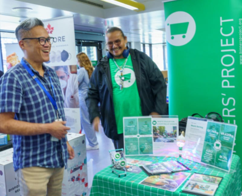 Benson Low (left) and a Binners Project representative at the 2025 Sustainability Fair at St. Paul’s Hospital. Benson supports the binners and their work. Photo by Brian Smith, Media Services, The Daily Scan.